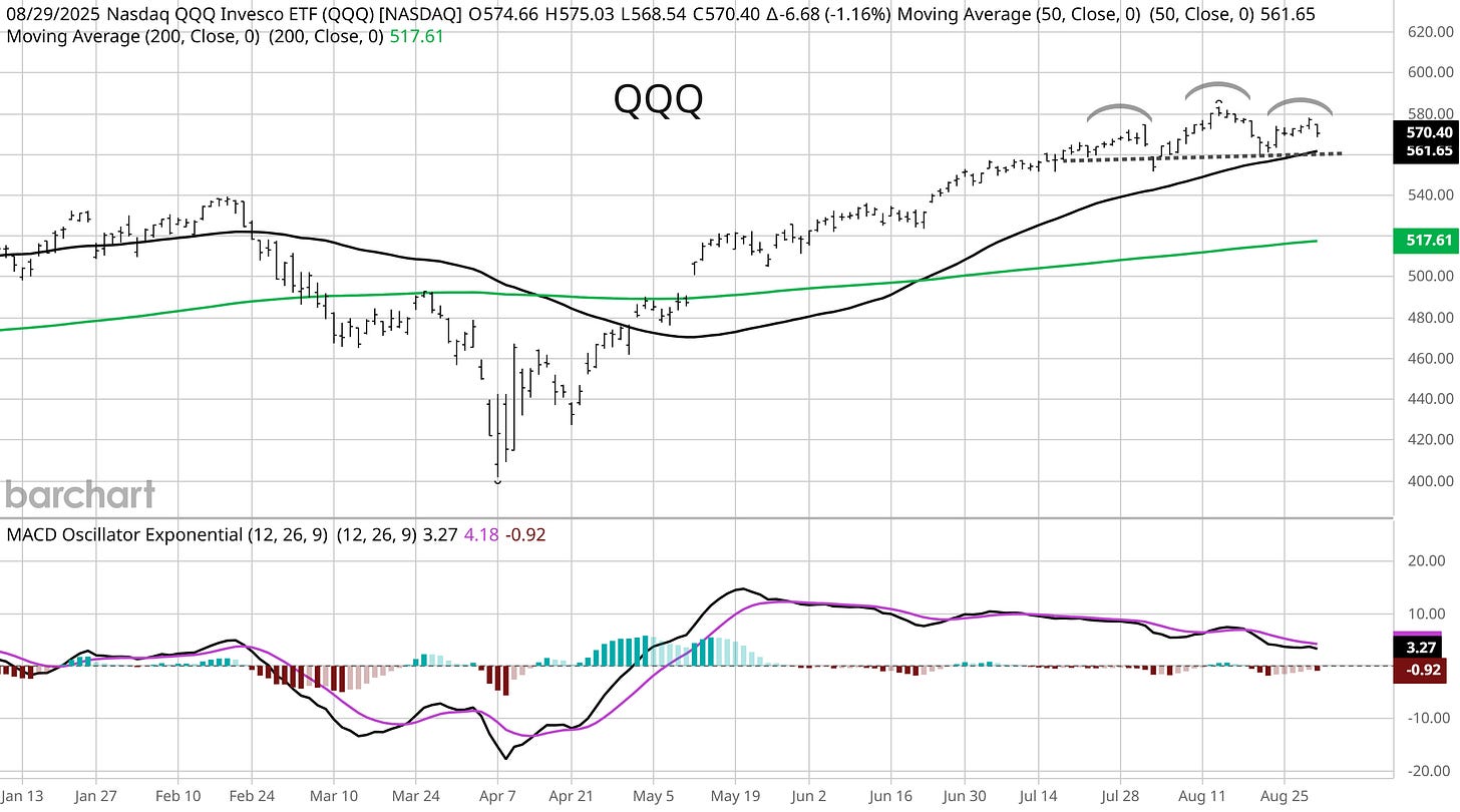 While the S&P 500 was making record highs last week, you can see in the chart below that QQQ has failed to confirm. QQQ is also potentially setting in a head and shoulders topping pattern, which would be completed with a break of the neckline at $560.