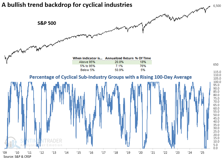 If the outlook for the economy is positive, then cyclical stock market sectors should respond with favorable price action. Stock prices discount future business conditions, and for the first time since early 2024 every cyclical sub-industry group has a rising 100-day moving average (MA - chart below). That shows strong participation across cyclicals that are trading in intermediate-term uptrends. That also tends to reflect a strong backdrop for the overall stock market. When at least 95% of cyclical sub-industries have a rising 100-day MA, the S&P 500 returns an annualized 20.8%.