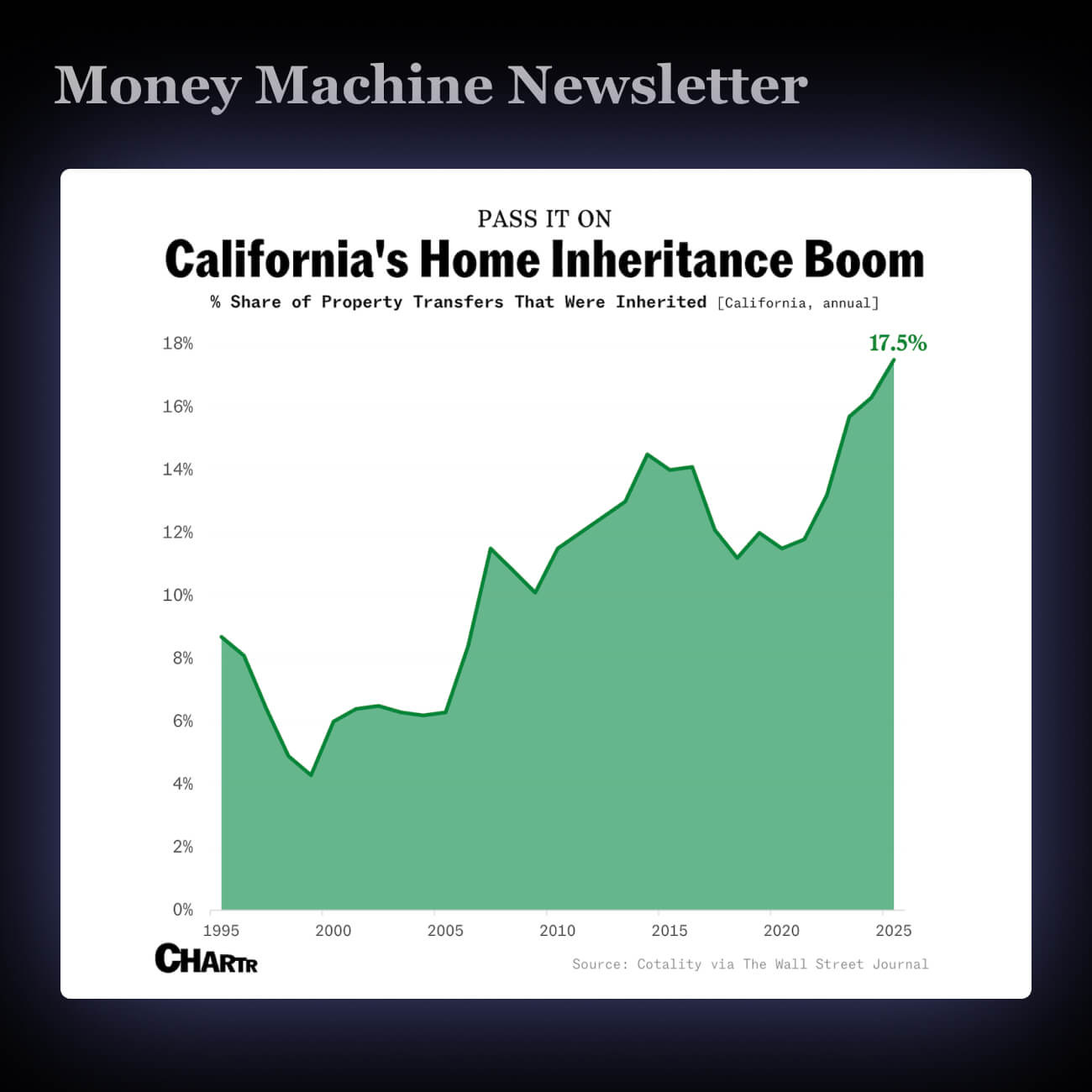 In California, 17.5% of home moves are now inheritances. That’s double the national average and twice what it was thirty years ago.